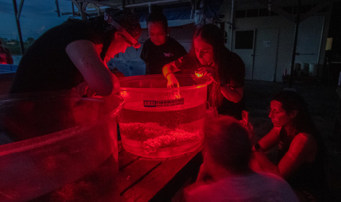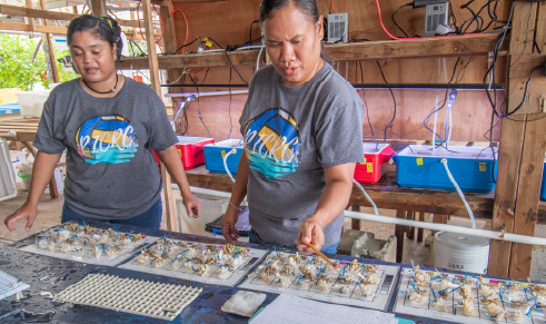 From April to May, corals in Palau spawn around the full moon. Researchers collect eggs and sperm from broodstock that have been selected for specific traits (i.e., heath tolerance, fluorescence or others) fertilize them, and rear the larvae on coral settlement devices. After several months, the juvenile corals are outplanted onto the reef.