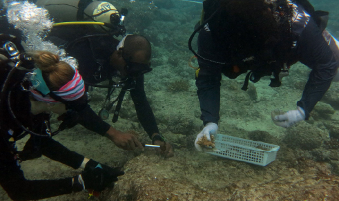 Rising ocean temperatures can lead to coral bleaching; however, some coral colonies are able to survive under high-temperature conditions. Researchers identify heat-resilient coral colonies and grow selected fragments in our nursery.