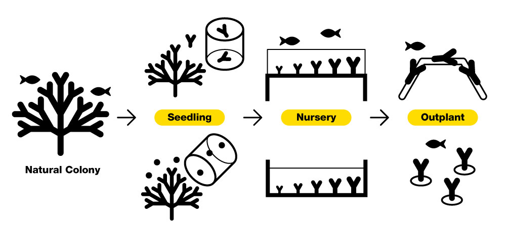 Coral restoration is the process of helping damaged reefs recover by growing and replanting corals in areas where reefs have declined.