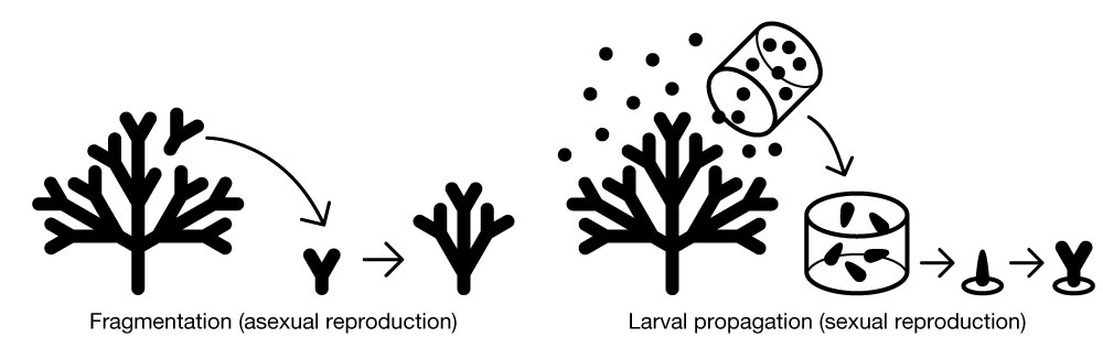 Corals can reproduce asexually and sexually: therefore, coral restoration is generally divided into two main categories: fragmentation and sexual larval propagation.